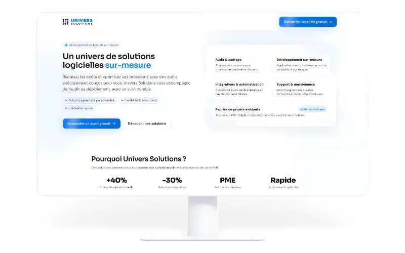 Univers Solutions est une entreprise spécialisée dans la conception de solutions logicielles sur-mesure pour les PME. Fondée par Maxime Mora, elle accompagne les entreprises dans l’optimisation de leurs processus métiers.